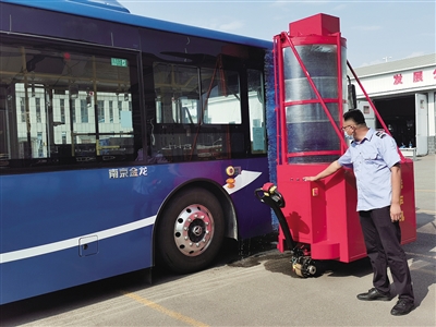 “以前的公交车靠人力或者龙门式洗车机,洗完需要至少10分钟,且存在诸多死角,技术科创新工作室经多次试验,设计研发出新型公交车专用移动式洗车机,一人操作就可实现滚轮擦洗、喷水、刮干等工序,如今洗车只需要两三分钟,非常节水,冬天还可以启用加热烘干模式,不会结冰。”呼和浩特市公交四公司电子研究人员杨冬表示,洗车机内配备电池,可在户外灵活移动,供多辆车循环使用,车内恒温水箱还设有阀门,自主调节洗车液和清水的比例。