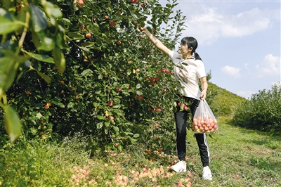 9月4日,游客在兴安盟突泉县学田乡林果地中采摘沙果。近日,突泉县学田乡的林果喜获丰收,吸引不少游客前来采摘观光。近年来,当地引导农民种植山里红、山丁子 、沙果、野山杏等特色林果共18.1万株。摄影/新华社记者 贝 赫