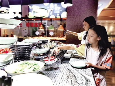 随后,记者又走访了商场内其他自助餐厅,在烧烤涮自助、比格披萨自助、盛江山自助料理等餐厅记者也发现,大多数顾客在取餐时都会少量拿取,确定口味喜欢后再进行适量取食,而餐桌上的食品也基本都能吃完,大家都在用实际行动来减少浪费。