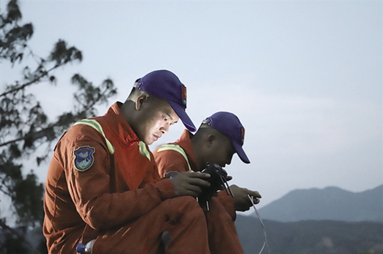 白天,象群在密林间穿梭、休息;晚上,下山觅食、赶路,有时象群一晚上走七八公里。两三台无人机换电池时要交替起飞,监测队员要始终盯着显示屏,才能实时监测象群。6月,云南进入雨季,追象变得更为艰难。密林中的象群移动速度很快,在显示屏上常常消失。从白天到黑夜,监测队员要不断转场,才能继续锁定象群的位置,最多时一夜要转场12次。有时,还要带上砍刀、红外望远镜、小无人机等装备徒步进入林地搜寻象群。在深山密林里,常常没有信号,为及时向指挥部发回画面和点位,他们要爬到山顶寻找信号。这些都需要森林消防员平时练就的户外生存和辨识地图、方向的专业技能。