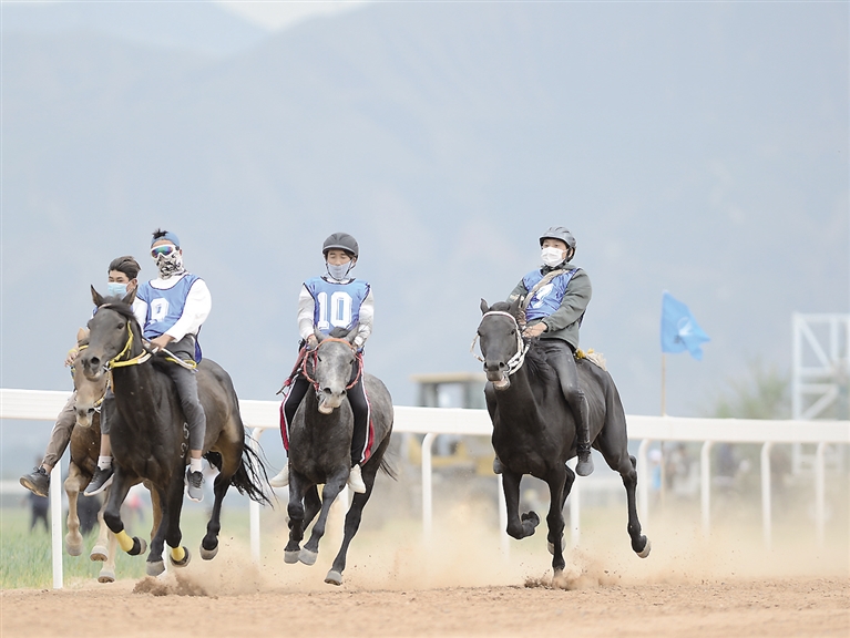 9月13日,选手在5000米速度赛马比赛中。当日,青海省第七届少数民族传统体育运动会举行5000米速度赛马项目比赛,选手们在赛场上策马扬鞭展现英姿。 摄影/新华社记者 张曼怡