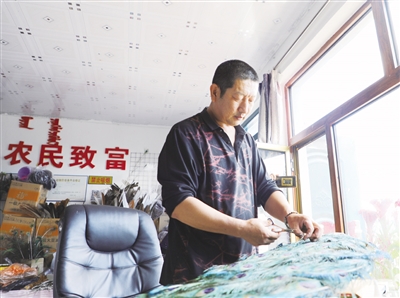 9月14日一早,家住乌兰浩特市区的楚杰就驾驶着自己的电动三轮车,行驶9公里来到孔雀园,开始他新的一天的工作——制作孔雀羽毛粘贴画。今年51岁的楚杰原本是一名木工,去年患上了腰椎间盘突出,正愁不能继续外出打工该怎么办时,遇上了孔雀园的创办人周海燕招收孔雀羽毛粘贴画学徒,他便报了名。