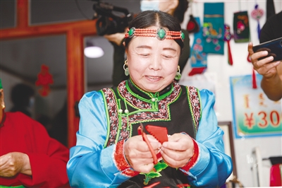 说话间,白文杰已将记者一行带到乌仁额吉札萨克图手工刺绣合作社,在这里,十余名“绣娘”正在切磋技艺,66岁的斯琴高娃就是其中一员。