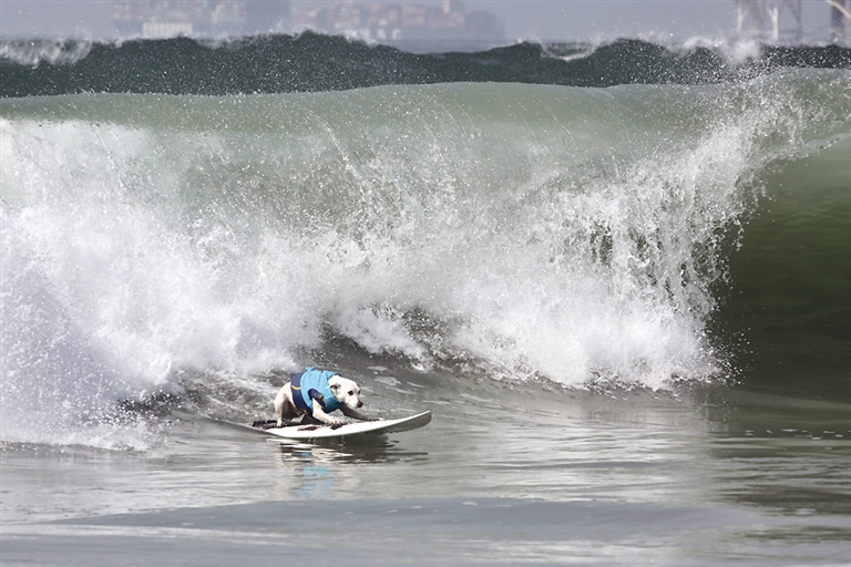一只参赛犬在比赛中乘风破浪。9月25日,一场别开生面的年度狗狗冲浪大赛在美国加利福尼亚州亨廷顿海滩举行。狗狗们乘风破浪,酷炫十足。