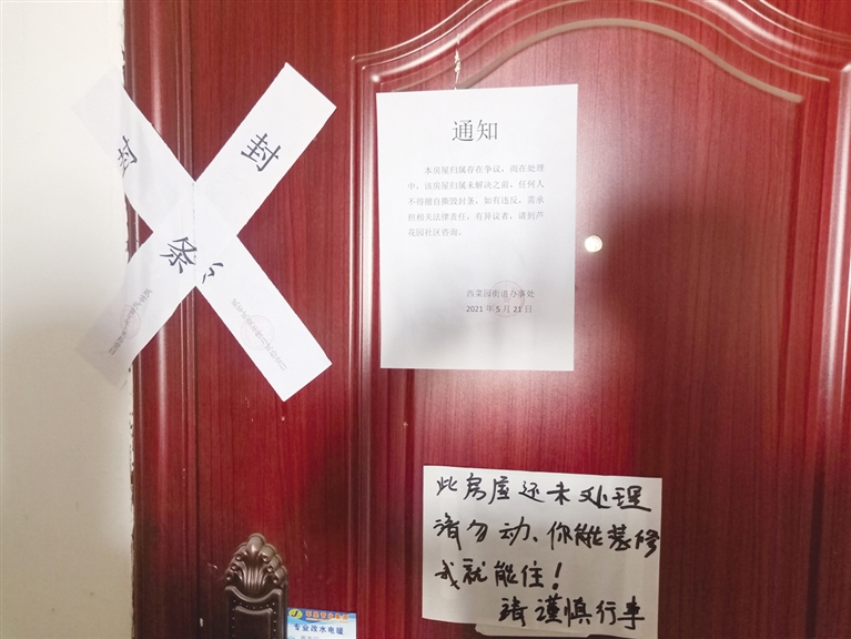 9月23日上午,记者与张先生来到玉泉区塞外名苑小区,记者发现C5幢的一些购房者已经装修完并入住。C5幢3单元25层共3户,每户门上都有玉泉区西菜园街道办事处贴的封条和通知,通知注明:本房屋归属存在争议,尚在处理中,该房屋归属未解决之前,任何人不得擅自撕毁封条。张先生对记者说:“2020年,西菜园街道办事处曾经把他和刘先生叫到一起处理过此事,问我们要房还是退钱。当时,刘先生选择的是要房,我选择的是退钱。可是,在西菜园街道办事处2021年8月6日发布的关于解决塞外名苑项目一房多卖等问题进度安排的公告中,退款人员名单中却没有我。我到街道办问原因,工作人员只是让我等。可是我真的等不起了,在外面租房子每月也得花很多钱。”