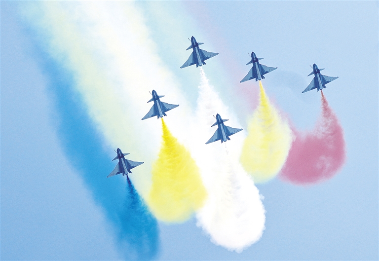 9月28日,中国空军八一飞行表演队在第十三届中国国际航空航天博览会开幕式上进行飞行表演。