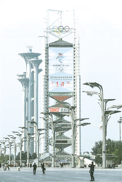 位于北京北部的双奥核心场馆区里,倒计时114天的巨大标识闪烁在奥运玲珑塔上。从水立方幻化为冰立方的国家游泳中心正在进行最后的修整。夕阳之中,建筑工人进行建材固定的声音回荡在空中。国家体育场的外侧,有工人悬挂在鸟巢枝丫般的外墙上进行粉刷维护。两个场馆之间的冬奥颁奖广场也已进入最后的检修完善阶段……