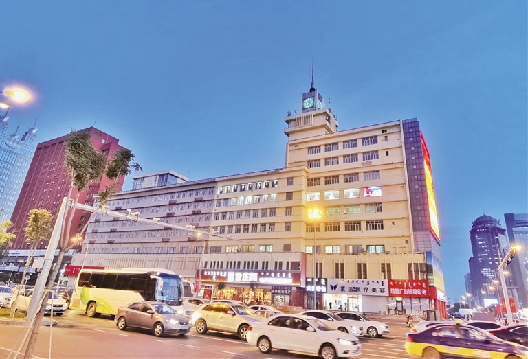 当日傍晚时分,天色渐暗,华灯初上,在斑斓的霓虹灯中,街道车水马龙,人群熙熙攘攘,一派繁华都市的景象。这座建于1983年的景观塔钟,依然和30多年前一样屹立在新华广场东侧的信息大厦楼顶,再次以“地标”姿态工作起来。