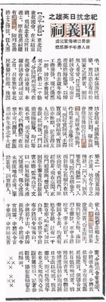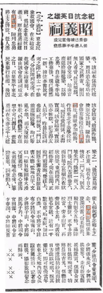 故而,救国会原计划在东北抗日烈士昭义祠正式成立之日,召集旅平东北民众举行祭礼一事也因而作罢。《义勇进行曲》歌名的命名者、辽吉黑民众后援会会长朱庆澜所题写的“昭义祠”大匾,也因此未能悬挂。但在爱国人士的坚持下,仍将牺牲于白山黑水间的抗日英烈灵位供奉于此,以祭奠英灵。