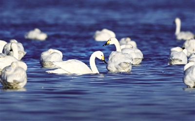 近日,陕西省榆林市榆阳区河口水库湿地迎来大批白天鹅、赤麻鸭等鸟类。近年来,位于毛乌素沙地南缘的榆阳区采取退牧还湿、禁牧减畜等有效措施,加强生态环境保护。河口水库湿地拥有大量浅滩、芦苇,地势平缓,水域宽广,野生鱼虾资源丰富,已经成为越冬候鸟途中觅食、停歇的理想之地。