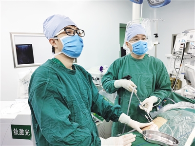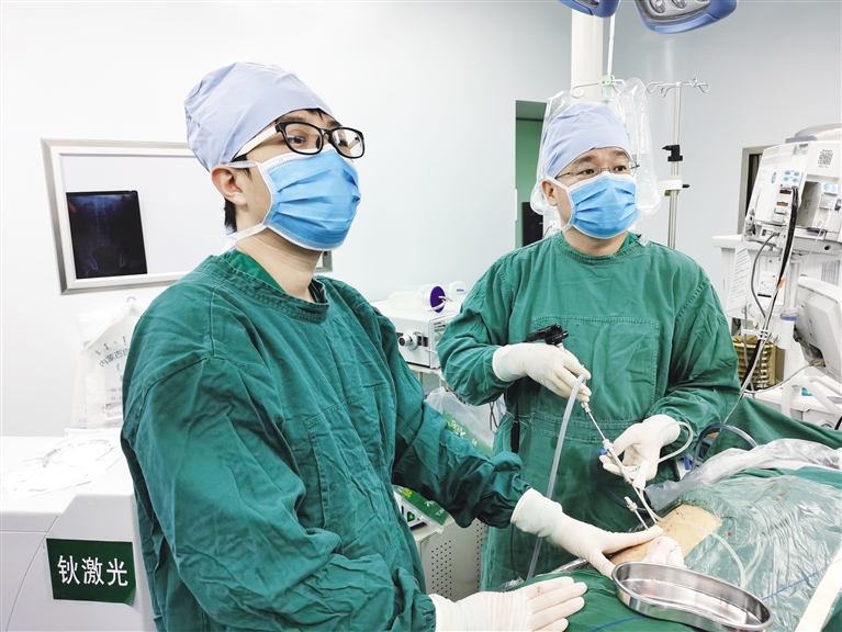 据刘俊峰主任介绍,经皮肾镜术针对疑难复杂的肾结石患者,具有良好的治疗效果,手术只需在患者腰部打两到三个吸管粗细的通道进入肾脏,用激光进行碎石取石术,有创伤小、美观、术后恢复快等特点。