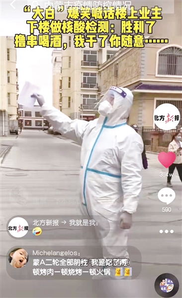 11月3日,记者几经周折联系到这名志愿者“大白”——二连浩特人杨立杰。杨立杰今年39岁,是一名退伍军人,平时在苏尼特右旗做家装建材生意,在此次新冠肺炎疫情发生初期,他带着物资逆向而行,回到二连浩特做起志愿者,“没想到无意间的喊话火了,非常感谢《北方新报》,让我以这样的方式出道,幸福来得有点突然。”杨立杰幽默地说。10月31日,二连浩特做第八次核酸检测,他和志愿者团队5时出来,就开始逐个单元挨家挨户去敲门叫居民做核酸检测,年纪大一些无法下楼的居民还要做好登记,以便上门采样。就这样,他们从1号楼到30号楼,一层一层地去动员,到32号楼的时候,作为一个200多斤的大胖子,杨立杰实在走不动了,就站在楼下开始喊,为了活跃气氛,他想到什么说什么,没想到被同行的志愿者拍成短视频发到朋友圈,一“喊”成名。