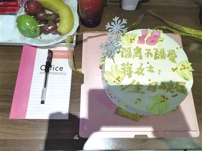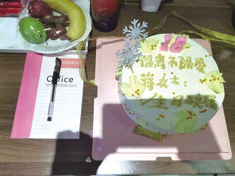 “滞留游客在办理入住时,我们都会录入基本信息,当时就留意到11月1日是蒋女士的生日,便决定为她策划一个生日惊喜,让她在这里度过一个特殊的生日。”11月3日,志愿者小瑞告诉记者,他们去蛋糕店挑选了生日蛋糕,并写下生日祝福:“隔离不隔离爱,蒋女士,生日快乐!”