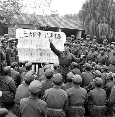 1934年11月,鄂豫皖省委在天台山刘家湾举行“纪念十月革命十七周年”阅兵活动,当15军团踏着整齐的步伐,高唱“红色战士个个要牢记,三大纪律八项得注意……”通过主席台时,博得一片喝彩、赞扬。不久,这首通俗易懂、朗朗上口的歌词刊登在总政治部的《红旗报》上,很快在部队中传播。后来,中央红军和第二、第四方面军先后到达陕北,这首歌又迅速传遍陕甘宁边区。