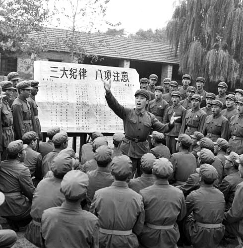 于是,他用了几天时间,编写出每行9字,共20行的《红色军人三大纪律八项注意歌》歌词,又在政治部宣传科长刘华清的协助下,把词填入苏区流行的《土地革命歌》曲调中: