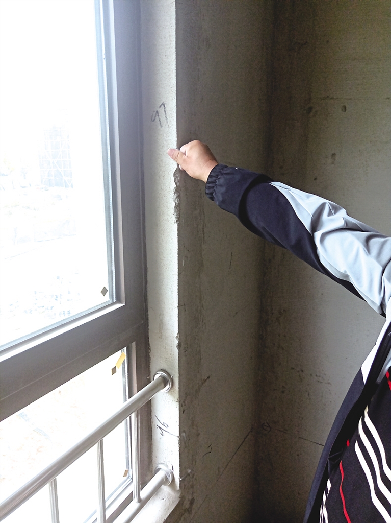 随后,记者与宗广林来到林西县绿洲·首府工地3号楼。记者发现,房间里的墙皮确实像宗广林说的那样,用手在墙角处稍一用力,墙皮就掉落。楼道的墙面已经刮了大白,但也有部分墙皮脱落。