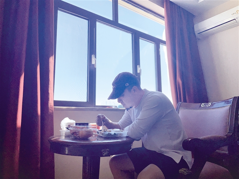 几乎每天吃饭的时候,王李杰都会和家人视频通话,尽可能将这边的情况告诉他们,让家人知道他在内蒙古吃得很好,住得很好,很安全,打消她们的担心和顾虑。“‘饲养员’这天送来的竟然是饺子,我发了视频以后,评论区隔离的游客都说吃的是饺子,原来当天是立冬。”王李杰说,隔离的生活每天很规律,早餐6时,午餐12时,晚餐18时。吃的有肉、有菜、有水果、鸡蛋、酸奶,还有当地的很多特产,一到饭点,他就开始等待志愿者们“投喂”了,他给志愿者还送了一个爱称“饲养员”。每当拿到餐食,他就冲着志愿者说一声“谢谢饲养员”,每每此时,整个楼道都回荡着志愿者欢乐的笑声。