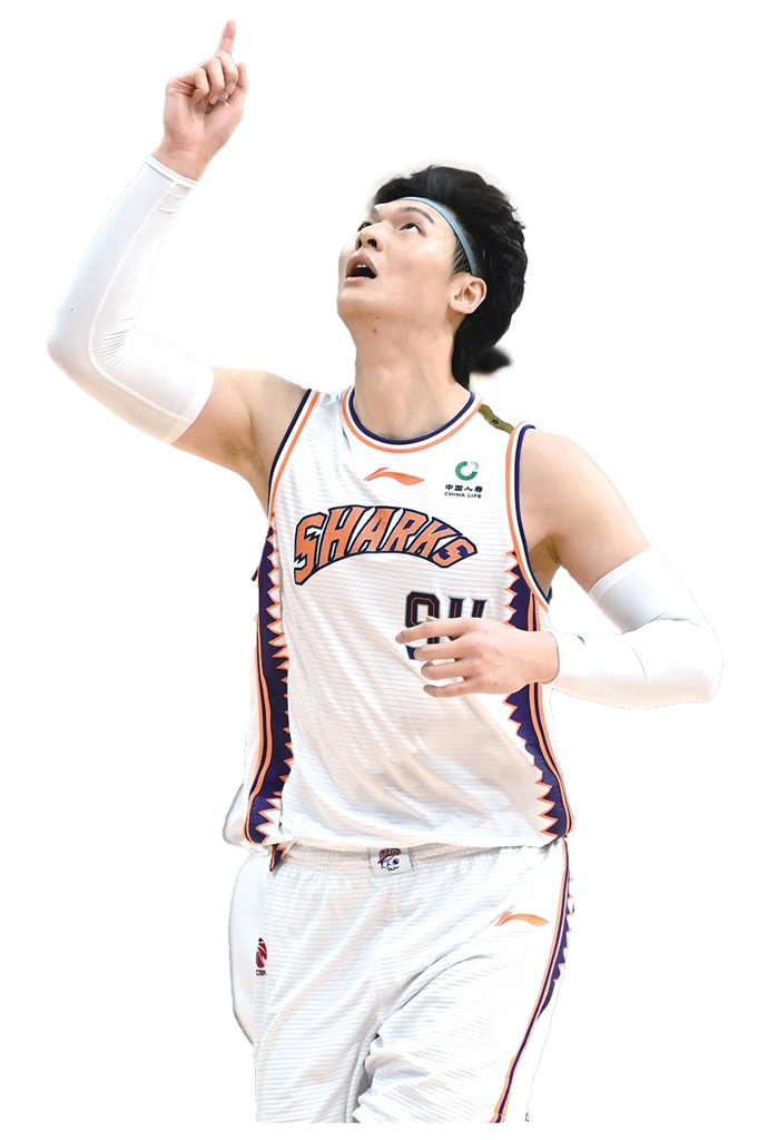 11月11日,上海久事队球员王哲林在进球后庆祝。当日,在CBA第一阶段第12轮比赛中,上海久事队以112:103战胜浙江稠州金租队。摄影/新华社记者 孙凡越