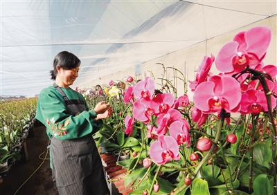 初冬,阳光充足的大棚温室里,俏丽的蝴蝶兰争相开放,给冬季带来多彩芬芳。11月15日,内蒙古丽翚苗木种植有限公司的工作人员正在大棚里打理盛开的蝴蝶兰。据了解,该公司以培育蝴蝶兰种苗和半成品为主,现有高标准日光温室20栋,是内蒙古规模最大的蝴蝶兰种植基地,品种包括草原红、光芒四射、满天红、绿如意等。年产蝴蝶兰成品花30万株,本地区市场占有率达80%,还销往上海、广东、江浙等市场,为呼和浩特市新城区塔利村、讨思浩村百余村民提供了就业岗位,带领村民致富增收。