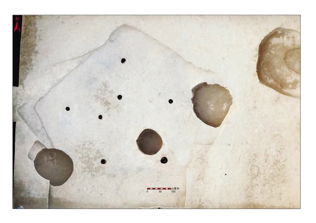 该考古项目负责人、太原市文物考古研究所研究员裴静蓉介绍,遗址内共发掘仰韶时期灰坑98座、陶窑11座、房址2座、明清墓葬6座,其中最突出的发现是一座面积约32平方米、平面略呈五边形的房址。地面上北、中、南有三排柱洞,每排2个,排列规律。房址南部有一圆形灶坑,其东南方向有烟道,灶坑底部与烟道相通。这座房址填土内出土陶片丰富,可辨器型有夹砂陶釜、夹砂灰陶罐、红陶钵、尖底瓶等。