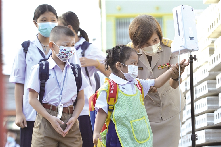 11月15日,学生在泰国春武里府一所学校测量体温并消毒洗手。泰国此前因新冠疫情停课的学校于11月15日起开始复课,但仍须严格遵守相关防疫措施。(据新华社报道)