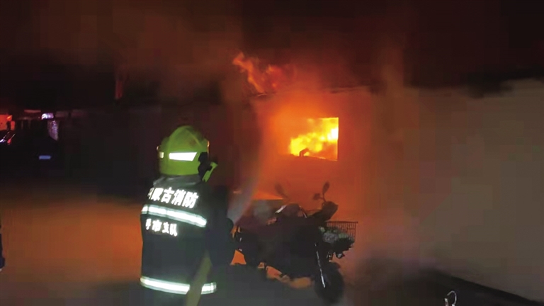 “车棚着火了!”事发当日凌晨,呼和浩特市消防救援支队特勤一站接到群众报警电话后,立即出动3辆消防车、21名消防员赶往火灾现场。消防员到达现场时,车棚内存放的数十辆电动自行车正处于猛烈燃烧阶段并伴有大量浓烟,现场无人员被困。因起火点紧邻居民楼,情况紧急,消防员立即开始灭火,疏散围观人员。确定物业人员断电后,消防员从车棚两侧对火势进行堵截、扑救,经过15分钟努力,大火被扑灭。