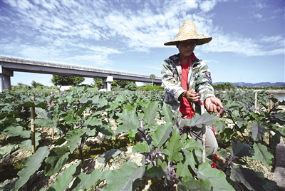 11月16日,三亚市崖州区的农民在管护茄子田。
