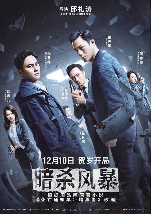 《暗杀风暴》讲述了轰动全城的连环杀人案接连发生,凡是收到“死亡通知单”的人,都将按预告日期,被神秘杀手残忍杀害。为尽快破案,爆炸案目击者黄少平(古天乐饰),警察罗飞(张智霖饰),专案组韩灏(吴镇宇饰)一起入局。真相不断在反转,惊人的秘密逐渐浮出水面……面对多起杀人案错综复杂的线索,张智霖饰演的警察罗飞抽丝剥茧冷静分析,一句“事情没有那么简单”,吊足观众胃口。作为“大湾区智商担当”,张智霖在片中将如何展开高智商推理,从扑朔迷离的重重谜案中寻觅真相的踪迹,让人好奇不已。吴镇宇则一改往日的反派形象,出演专案组警察韩灏,与张智霖联手全力追踪神秘杀手。同时,预告里出现的胡杏儿、周秀娜、吕良伟、任达华等熟悉的港片面孔,也让人好奇他们在本片里的角色和剧情。