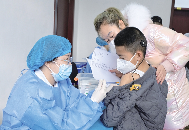11月19日,一名儿童在呼和浩特市石化医院接种新冠疫苗。近日,呼和浩特市教育部门陆续组织辖区内3~11周岁儿童接种新冠疫苗。为确保儿童疫苗接种安全,各接种点按照有儿科急诊急救人员驻点保障、有儿童适用急救设备药品、有120急救车现场值守、有二级以上综合医院救治绿色通道的“四有”原则,全面做好医疗救治保障,确保受种者安全。摄影/北方新报正北方网首席记者 牛天甲