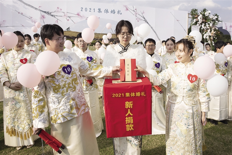 11月27日,新人们在集体婚礼现场为诸暨市的环卫工人“爱心早餐”慈善项目捐款。