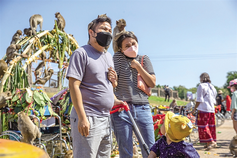 11月28日,游客在泰国华富里与猴子合照。当日,有泰国“猴城”之称的华富里举办一年一度的“猴子自助餐节”,人们为猴子提供水果和饮料,感谢它们吸引游客前来。摄影/新华社记者 王 腾