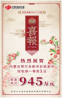 中国福利彩票双色球游戏第2021131期开奖,这是今年双色球12亿元大派奖活动的第一期派奖。当期双色球红球号码为08、11、18、19、20、24,蓝球号码为01的中奖彩票诞生在鄂尔多斯市伊金霍洛旗阿镇沟河路康馨苑6号底商第15276866号福彩销售站。幸运彩民吴先生凭借10元机选5注的投注方式,成功揽获一等奖1注,奖金合计9453797元。