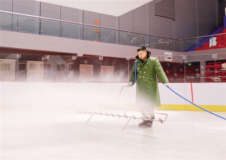 随着2022北京冬奥会的临近,呼和浩特的冰雪运动氛围也愈加浓厚。11月30日,工作人员正在为呼和浩特体育中心综合馆铺设“牛奶冰”。连日来,该中心冰场转换工作正在如火如荼的进行当中,预计12月4日向公众开放,届时市民可以在专业冰场上畅享滑冰带来的乐趣。另外,我区喜迎“北京冬奥会”火种展示活动也将在该场地举行。