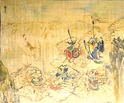 当然,不管是黄帝与蚩尤君臣说,还是父子说,始终都是小众说法。因为在春秋战国时,黄帝战蚩尤的传说就已经深入人心了。《山海经·大荒北经》就记录了黄帝战蚩尤的故事。蚩尤发明兵器攻打黄帝,黄帝就派应龙在冀州的郊野进攻蚩尤。应龙积蓄了洪水,而蚩尤就请风伯雨师降下大风雨。于是黄帝又请来女魃。女魃所到之处大旱,大风雨停止了,应龙也就杀了蚩尤。后来女魃不能回到天上,住在的地方都不下雨。叔均就对黄帝进言,把女魃安置在赤水之北。后来叔均就做了农田的始祖。而女魃有时候会逃跑,人们就用“神北行”的咒语来驱逐她。