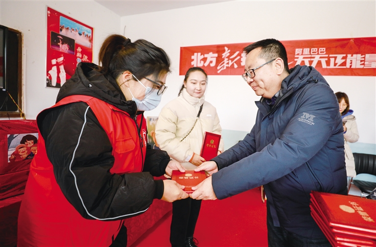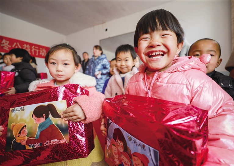 打包整理、现场发放……12月8日上午,由《北方新报》联合阿里巴巴天天正能量发起的2021“针心针意”大型暖冬公益行动走进乌兰察布市凉城县天成乡中心校,带着众多志愿者和爱心市民涓涓爱心的编织物品、文具、玩具、图书等组合而成的爱心盲盒送达到31名留守儿童手中,让孩子们感受到冬日的温暖。