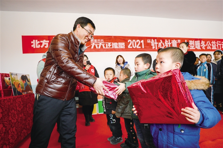 “又是一年寒冬至,爱心人士为我们的孩子们送来了厚实的手套、保暖的围巾、舒适的帽子,让孩子们在这个寒冬感受到社会各界的关爱……”在天成乡中心校任职20年的数学兼美术老师成肸梅担纲活动主持人,随着她的话音落下,由《 北方新报》联合阿里巴巴天天正能量共同发起的2021“针心针意”大型暖冬公益行动首批爱心盲盒发放仪式正式拉开帷幕。“今天能够亲自来到凉城县天成乡中心校,看到这么多可爱的小朋友们,心情非常激动。《北方新报》联合阿里巴巴天天正能量已经连续3年举办‘针心针意’大型暖冬公益行动,为卓资县、清水河县、武川县近千名孩子送去了温暖大礼包,今年冬天来临,我们继续带着爱和祝福出发……”在爱心盲盒发放仪式现场,《北方新报》、正北方网总经理陈曦照一番热情洋溢的开场白赢得了现场阵阵掌声。