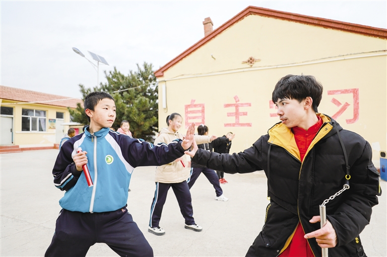 刘小凯先以功夫礼仪双手抱拳给大家行礼,然后开始一板一眼的教学:“现在做一下功夫压腿,一只脚在前面,身体挺直,双手放在前腿上,后腿向后蹬直……”刘小凯一边演示,一边教学生们练习基本功。采访中记者了解到,他虽然只有26岁,却已经斩获第七届澳门国际武术节双截棍全能冠军、河北邯郸第二届国际武学交流大会双截棍全能冠军、山西太原第九届武术锦标赛双截棍全能冠军等多项殊荣,被誉为“中华棍王”“功夫一刘”,目前还创立了功夫基地,专门弘扬中国功夫,弘扬传统文化。“这次很高兴能跟随《北方新报》的活动一起来天成乡中心校看望孩子们,孩子们都很有灵气,很多动作一学就会,希望有机会还能再来。”刘小凯说道。