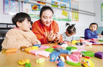 “我第一次上黏土手工课,感觉真好玩。”5岁的小宇(化名)拿着做好的小鸡展示给老师看,成就感十足。豪豪(化名)也不甘落后,虽然做出的小鸡模样有些不尽如人意,黑色和黄色彩泥混在了一起,被其他小朋友调侃成是“非洲火鸡”,他还是觉得很开心,拿着作品爱不释手。