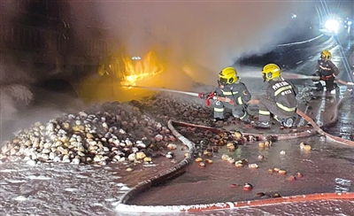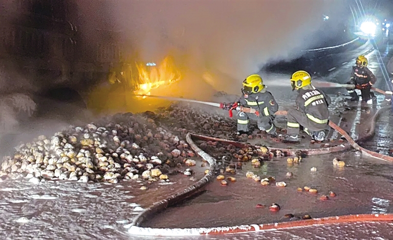 消防员到达现场后发现,货车正在猛烈燃烧,车身被火光包围,受风力影响,蔓延的火舌引燃了道路两边的枯草。消防员立即架起四支水枪,两支用于扑灭道路两旁的枯草起火,另外两支水枪从车辆两侧进行灭火。经过20多分钟努力,明火被全部扑灭。事故原因正在进一步调查中。