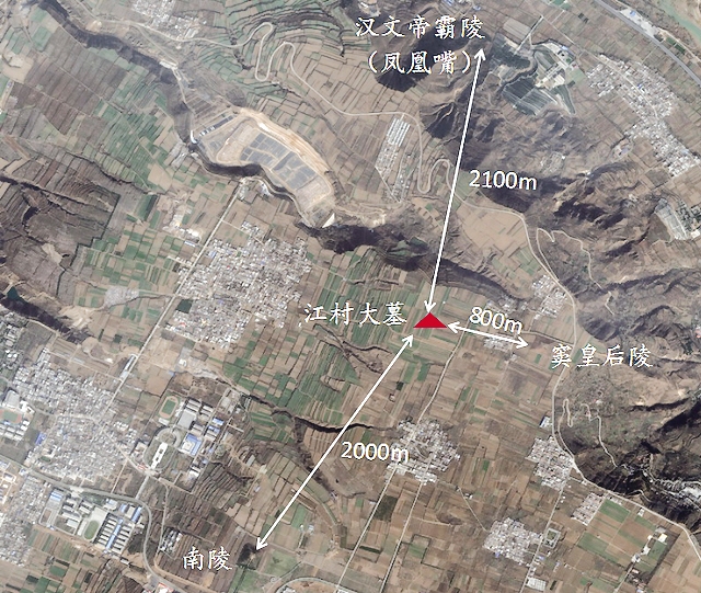 江村大墓位于陕西省西安市灞桥区。2016年江村大墓外藏坑受到盗扰,为确认墓葬保存状态及周边文物分布情况,经国家文物局批准,考古工作者对江村大墓及其附近的窦皇后陵、薄太后南陵和相传为汉文帝霸陵的“凤凰嘴”地点,进行了系统的考古调查、勘探,并对陵园外藏坑进行了考古发掘,目前基本确认江村大墓为西汉早期汉文帝刘恒的霸陵。