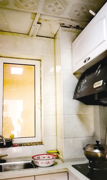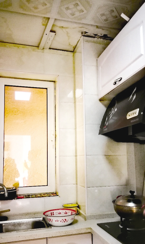 当天上午,记者和李女士来到三楼住户于先生家中,看到厨房天花板的墙角处有明显被浸湿的痕迹,天花板上的腻子也被泡掉了。于先生说,大约半个多月前,厨房天花板上开始滴水,他们打开天花板吊顶,发现已经被水浸泡,立即找李女士查看漏水原因。然而,李女士家中所有管道都被包裹住,他们并未找到漏水点。之后,于先生家的厨房便时常发生漏水现象,漏水时间多数在傍晚做饭的时段。