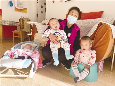 这个时间,“爸爸”外出工作了,52岁的“妈妈”邹吉红正忙着给4个月大的轩轩喂奶粉。阳光照进屋里,轩轩躺在婴儿摇椅上晒着太阳,特别安静。两岁的小唐和9个月的康康则在地垫上玩耍。