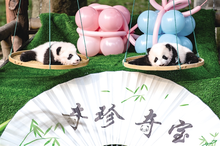 当日,重庆动物园为大熊猫龙凤胎宝宝“奇珍、奇宝”,以及大熊猫双胞胎宝宝“星星、辰辰”举行命名活动。