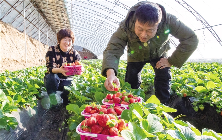 12月27日,游客在呼和浩特市玉泉区密密板村润之田合作社的大棚内采摘草莓。眼下正是冬季草莓陆续上市的时节,棚内一垄垄秧苗油绿茂盛,一颗颗鲜红饱满的草莓点缀其间,娇艳诱人,甜香阵阵,吸引众多游人前往采摘。