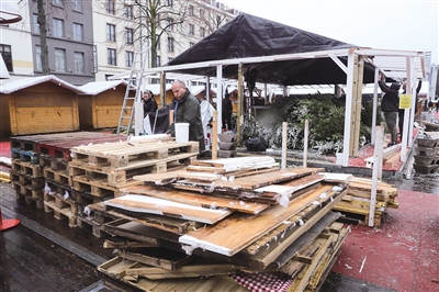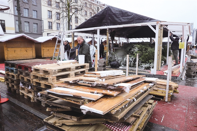12月27日,工作人员在比利时布鲁塞尔提前关闭的圣诞市场拆除商铺。由于奥密克戎感染病例激增,比利时自26日起进一步收紧防疫限制措施,包括关闭电影院、剧院和音乐厅,禁止室内活动,限制商店购物人数等。 摄影/新华社记者 郑焕松