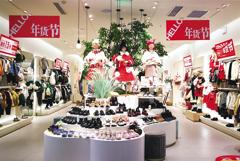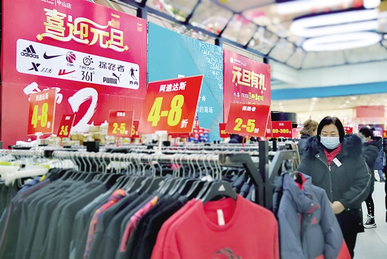 在王府井奥莱的促销中厅,“喜迎元旦”“元旦有礼”等大幅海报非常醒目,探路者、太平鸟、乔丹等各类服装都是2折起,不少消费者争相选购新衣。孙女士准备为孩子选购几件新衣,她说,现在买真的很划算,折扣力度挺大。
