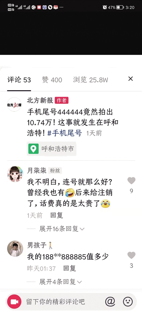 10.74万成交!呼和浩特一法院成功拍卖尾号“444444”手机号码……~~~