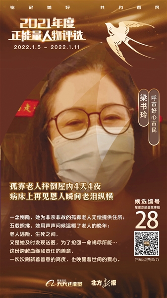 本次评选投票从1月5日零时正式开始,至1月11日24时结束,最终评选结果将于1月12日在“天天正能量”官方微博、公众号、头条号、抖音号等各平台公布。欢迎您长按识别图片下方二维码(如图),或关注“天天正能量”官方微信(ID:zhnlali),点击左下角“年度评选”进入投票页面,为咱内蒙古的候选人梁书玲(年度正能量故事组候选组28号)点赞助力,让她的温暖故事在2022年继续绽放光芒。