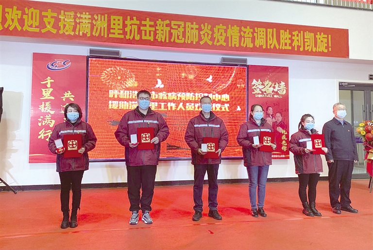 2021年12月29日,呼和浩特市疾控中心举行温馨的仪式,欢迎从满洲里一线凯旋的刘小平、田月英、秦圣洁、李晓娟、谢天祥5人。他们中有20多年党龄的老党员,也有刚刚加入党组织的90后。在这场等不了、输不起、必须胜的疫情防控阻击战中,他们鏖战近20天,最终不辱使命,载誉而归。