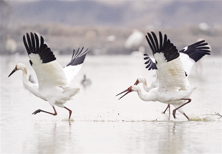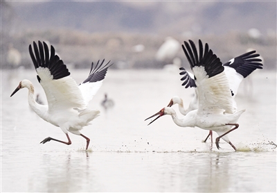 新年伊始,在位于鄱阳湖畔的南昌高新区鲤鱼洲管理处五星白鹤保护小区里,来此越冬的国家一级保护鸟类白鹤展翅起舞,姿态万千。摄影/新华社记者 万 象
